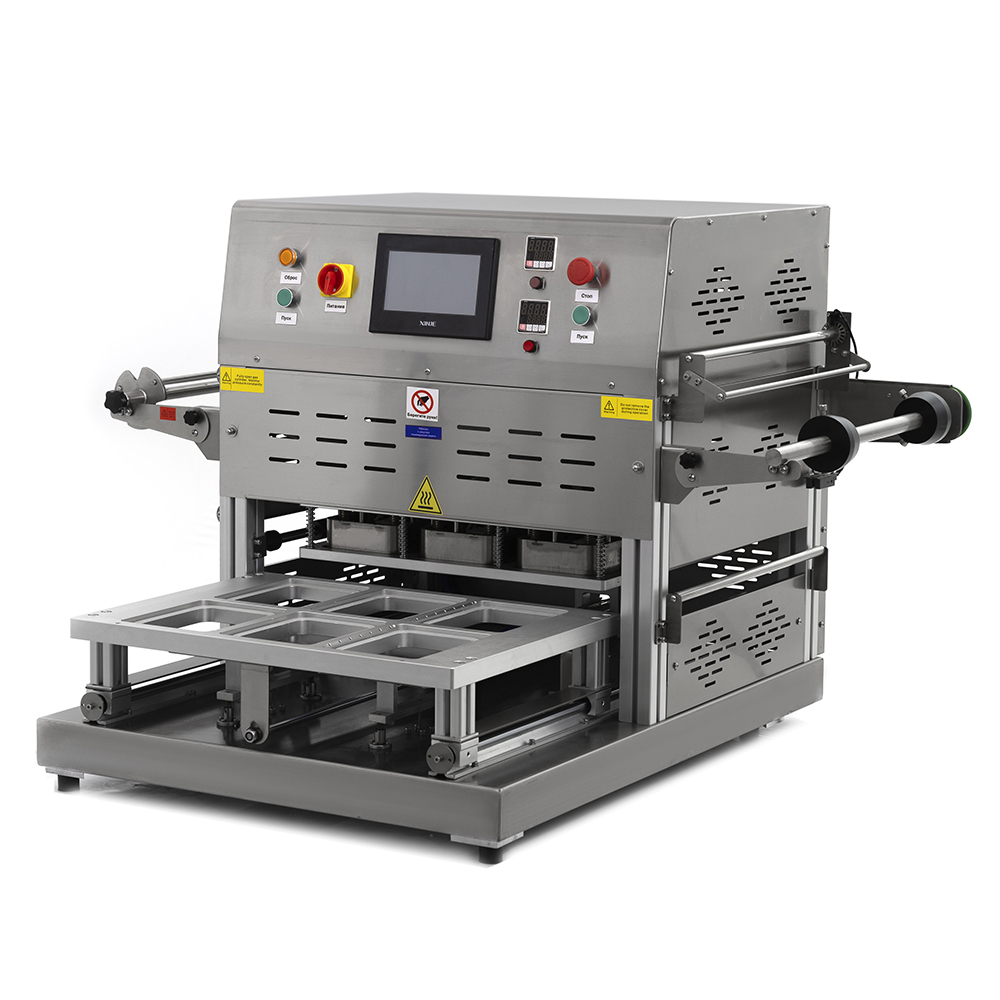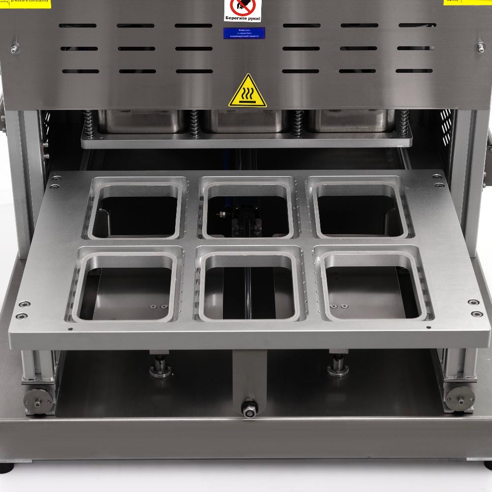 - это полуавтоматический аппарат для герметичной упаковки пищевых продуктов в готовые лотки (контейнеры) из пластика или алюминия. Оборудование удаляет воздух из упаковки и замещает его инертным газом (например, азотом), после чего термосваривает многослойную плёнку и обрезает её точно по контуру лотка. Модель оснащена комплектной матрицей размером 6 лотков размерами 187x137 мм, подходит для предприятий общественного питания, цехов по производству полуфабрикатов, мясной и мучной продукции, супермаркетов.