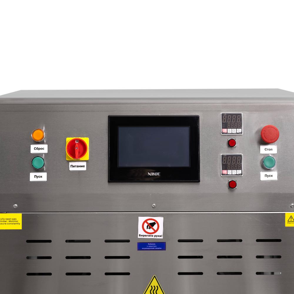 - Автоматизация и точная настройка. Управление осуществляется через сенсорный экран с возможностью программирования температуры нагрева (два терморегулятора), времени запечатывания, подъёма и накачивания газа. Аппарат автоматически обрезает плёнку по контуру лотка, обеспечивая аккуратную упаковку.